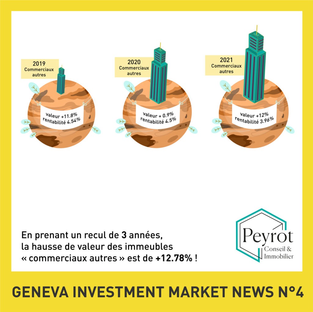 Concrètement les valeurs des immeubles grimpent, avec +12% pour les immeubles « commerciaux-autres » les plus périphériques du canton, +9.84% pour les immeubles « commerciaux zone 2 ». La seule baisse de valeur est celle des immeubles « commerciaux zone 1 » avec – 13.54%. Il faut néanmoins relever que les immeubles de la zone 1 s’échangent depuis 2017, à un taux moyen de 3,11%, bien en dessous des autres catégories. Concernant les immeubles de logement, c’est une hausse de 7.65%. En prenant un recul de 5 années, la hausse de valeur des immeubles est encore plus spectaculaire : +24.7% pour les « commerciaux autres », + 18.7% pour les « immeubles de logement » !